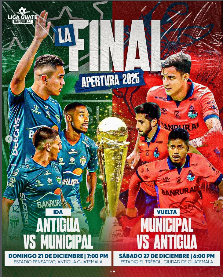 La Liga Guate Banrural oficializó el calendario de la gran final, estableciendo que el primer partido se jugará en Antigua Guatemala y el encuentro decisivo se disputará en la Ciudad de Guatemala. De esta manera, la final de la Liga de Guatemala 2025 se desarrollará en dos escenarios emblemáticos del fútbol nacional: el Estadio Pensativo y el Estadio El Trébol.