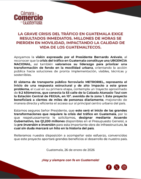 El Ejecutivo ha reiterado en ocasiones anteriores su interés en impulsar proyectos de transporte masivo. Sin embargo, las cámaras empresariales insisten en que el Metro Riel en Guatemala debe avanzar con mayor rapidez hacia su fase de ejecución.